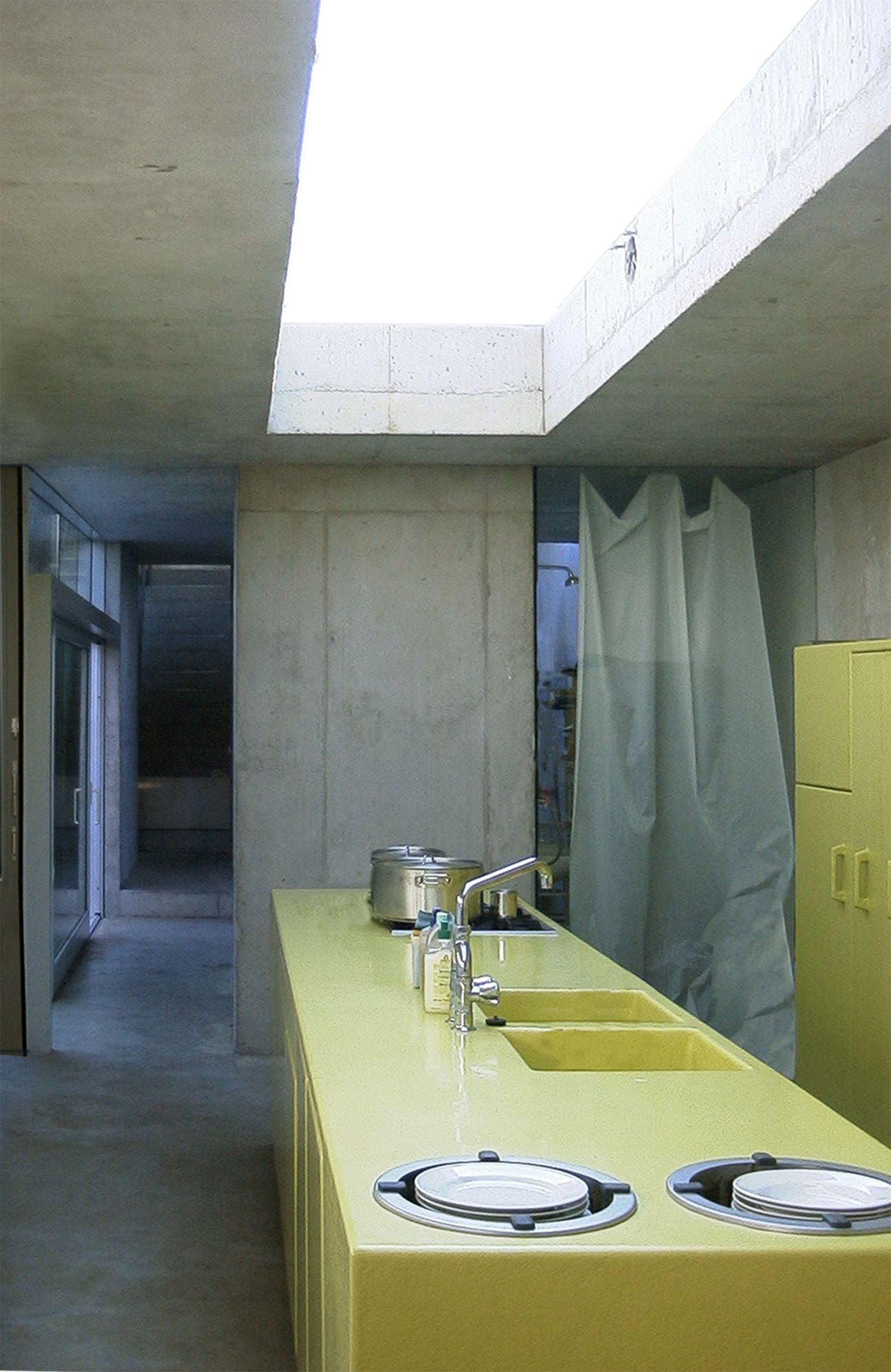 The living and working space on Geisselstraße addresses the array of legal conditions while generously providing a sequence of 360 light-flooded square meters on the extremely long and narrow plot. The volume closest to the street contains a three-story house with living quarters and the client’s atelier; at the rear there is a two-story garden house for their children. The two units are connected via a separable single-story link that contains shared spaces such as kitchens and bathrooms. The building’s irregular shape and connected volumes therefore make full use of this infill site. The building is understood as a living and working space which, despite the neighborhood’s high density, is still able to provide green and outdoor areas of varying sizes by using the terraces, roof garden, ground floor garden, and inner courtyard, which are in constant dialogue with the interior. The concrete structure is clad using two facade systems: the atelier is covered in multi-layered polycarbonate sheets and aluminum louver windows, while the garden house has an insulated glass facade with sliding wood elements.
