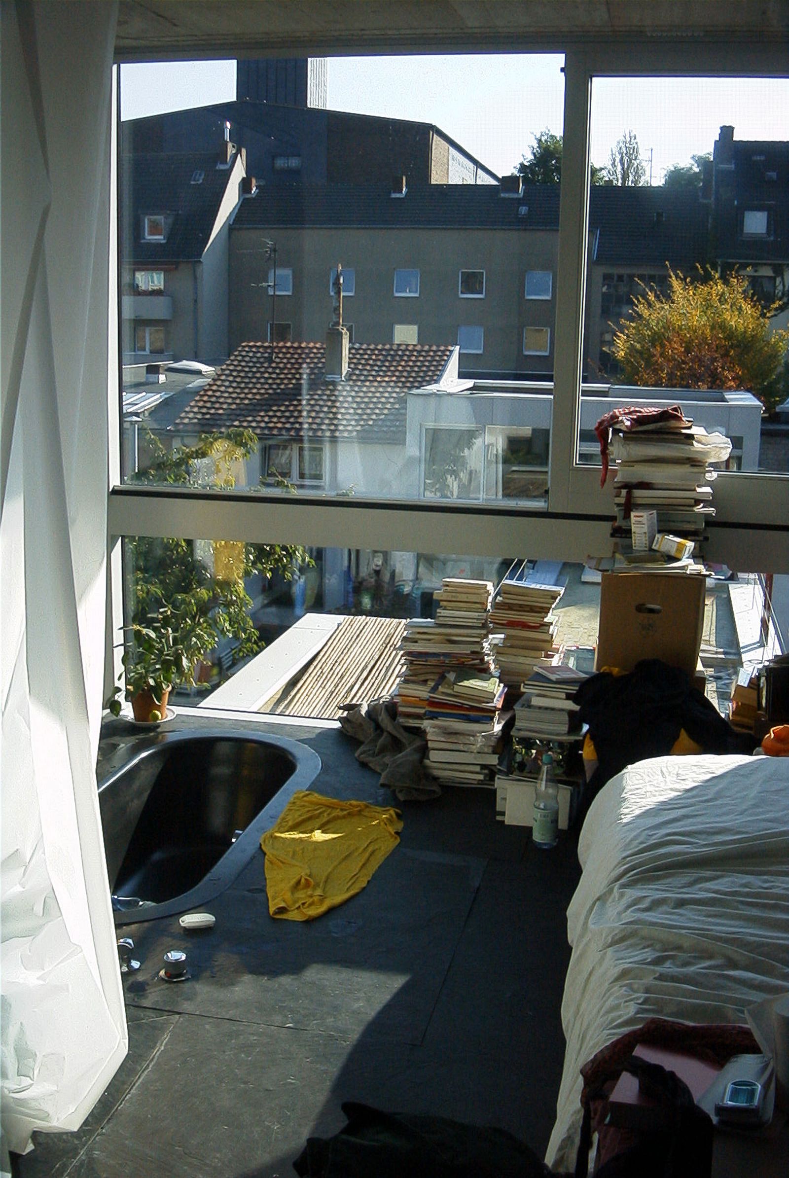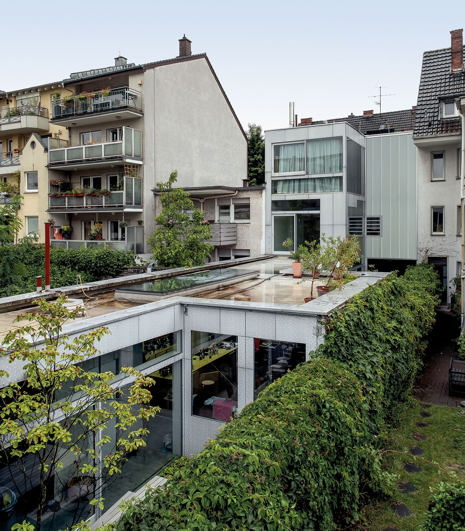 This building is located in Ehrenfeld, a typical Cologne residential neighborhood characterized by its mix of buildings from different periods of the city’s postwar history. Due to the legal situation and the complex contextual parameters, a gap between two existing buildings had not been developed for over 50 years until the city gave circumstantial permission to overbuild the site. The 6.6 × 42 meter lot was burdened with various restrictions concerning distance space, ridge height, existing structure, and maximum buildable volume, among others. One of the adjoining buildings was already built as an exception due to its two-story height. No further development in the area was anticipated. Therefore, it was feared that adding a second exceptional building would completely block light from entering the buildings at the rear. Instead, the design team decided to use this constraint to determine the building’s staggered form.