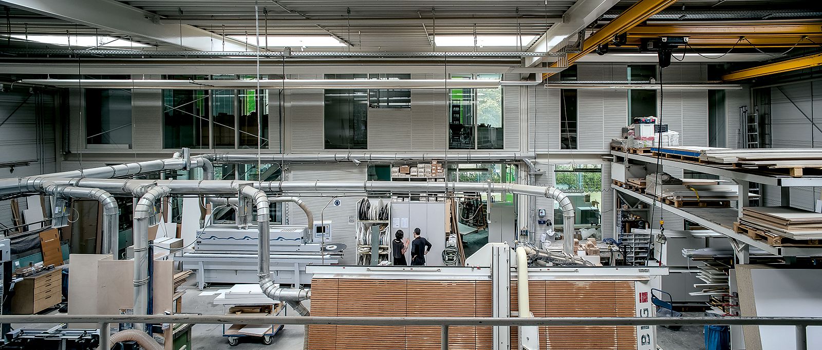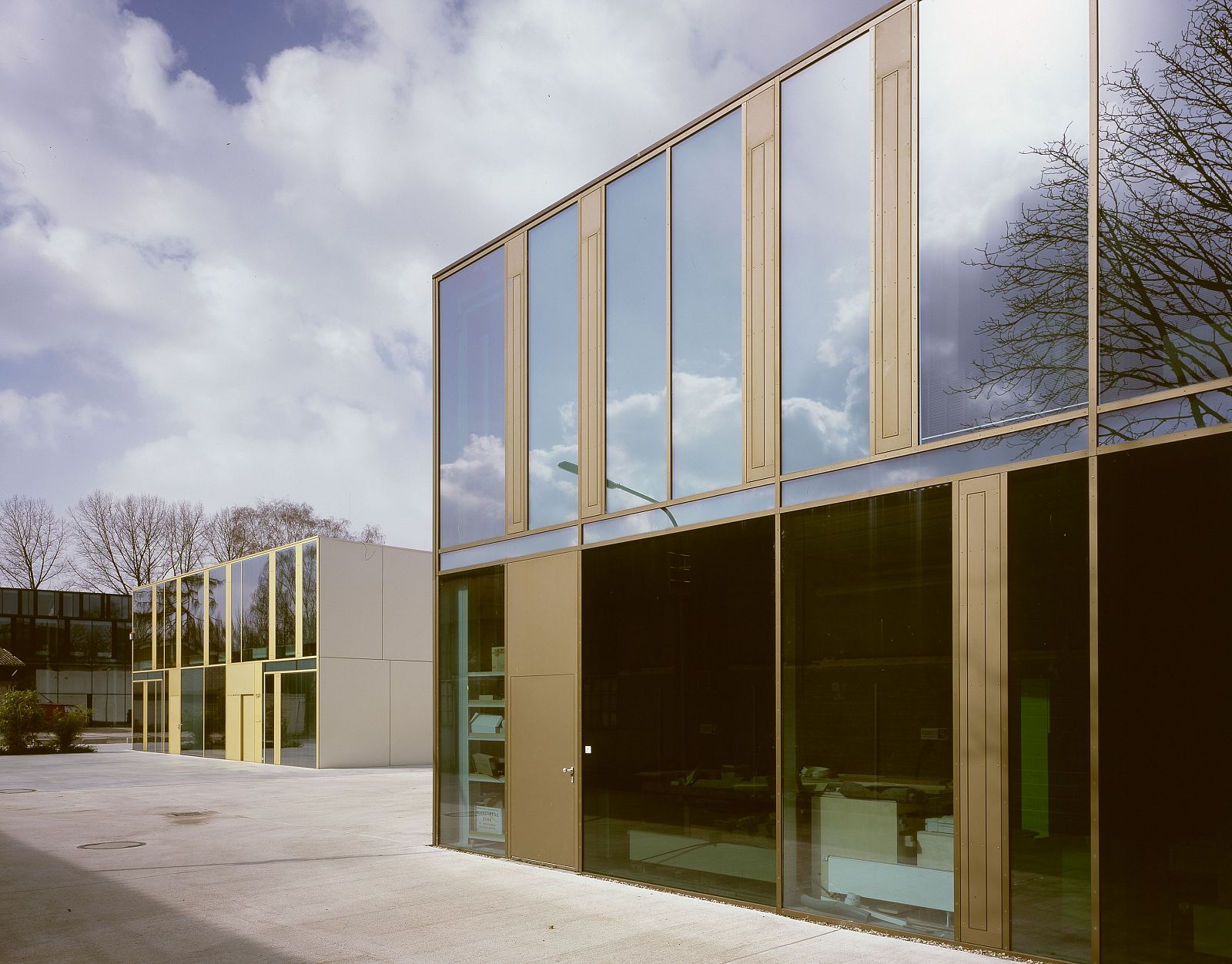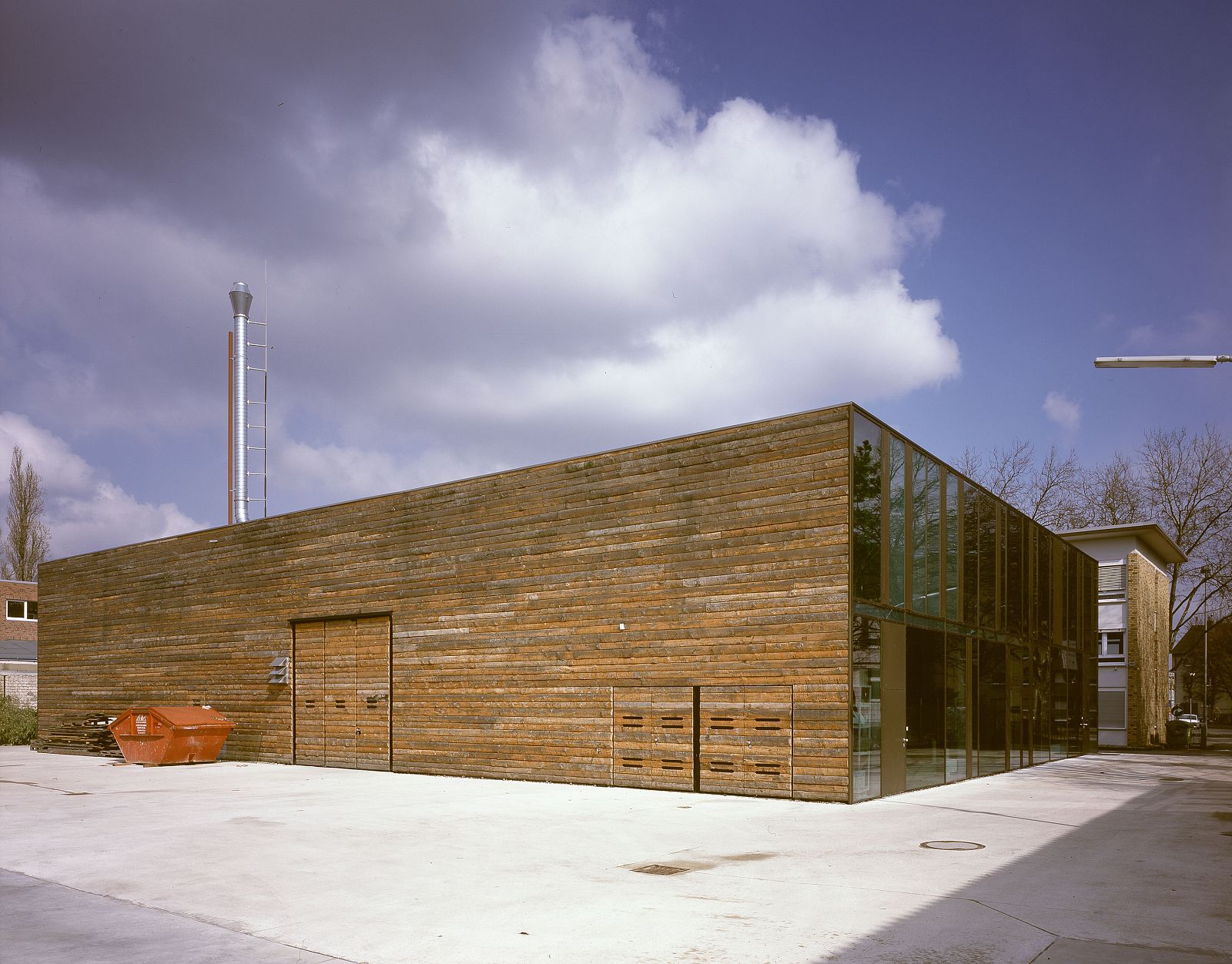 The carpentry workshop Cramer I was erected on a single plot on an inner-city industrial estate in Cologne, together with the dental laboratory 0097 Wentzsche. An important premise for the feasibility of both buildings, jointly named “standard+,” was a cost-effective design that would be affordable for medium-sized craft businesses. The standard+ design caters for the economic and functional needs of the clients by working with ready-made pavilions. As a result, the dental technician’s building is smaller (455 square meters) while the carpenter’s building contains 860 square meters. In addition to the wood workshop, rooms in the larger building can therefore be rented out as small studios. The simple cubic volumes were constructed using a standardized steel structure. The short sides of the structure are clad with prefabricated glass elements and operable ventilation openings, produced by the local glass manufacturer Dönges (0066 Dönges I). Functions such as offices and ateliers were placed behind the glazed facades to take advantage of the sunlight during working hours. The longer sides of the building contain the workshops and laboratories which do not require daylight, and could therefore be completely closed. This system allowed the occupants to clad their portion of the facade in a way that represents their business, illustrating the installation of the different crafts around the building. The carpenter clad the closed facades of his unit with horizontal tree trunks—a reference to Le Corbusier’s Cabanon.