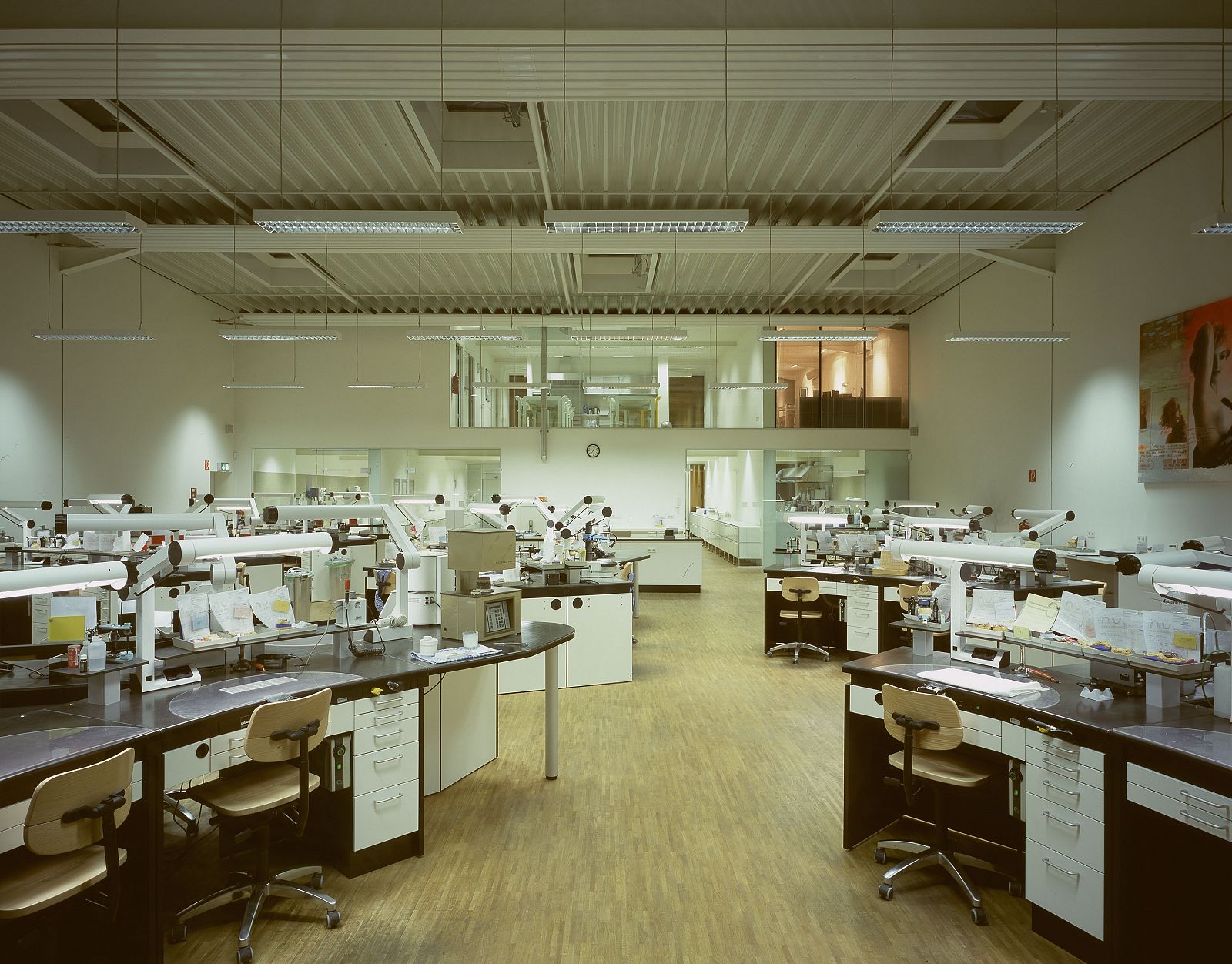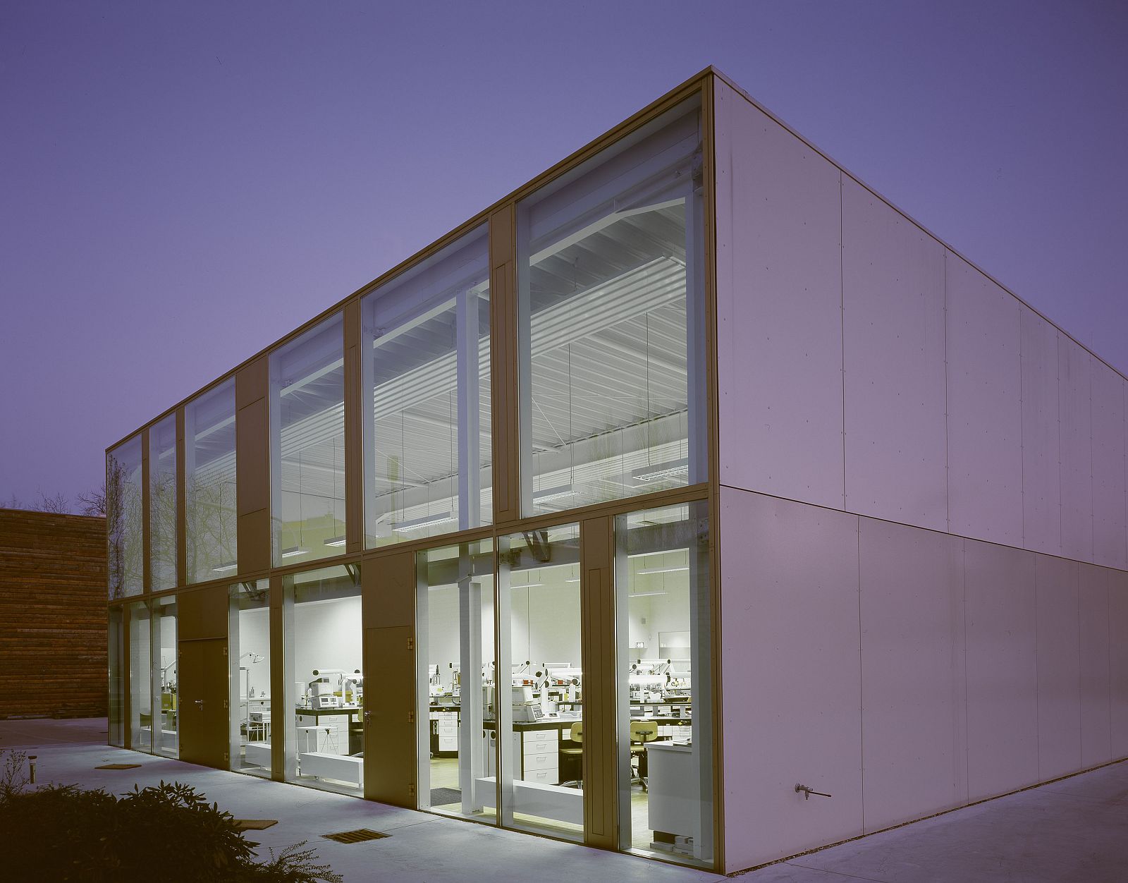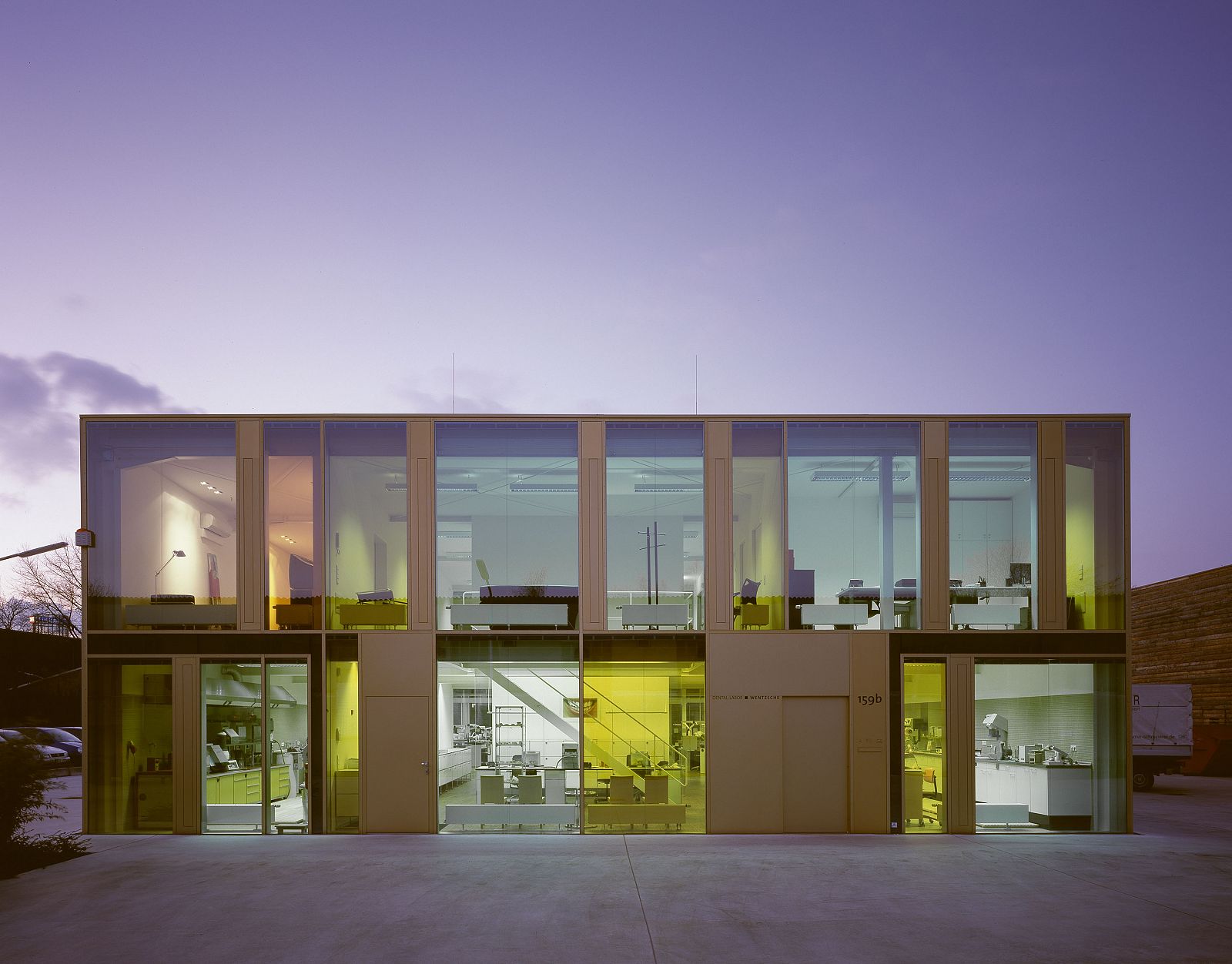 The dental laboratory Wentzsche was erected on a single plot on an inner-city industrial estate in Cologne, together with the carpentry workshop 0074 Cramer I. An important premise for the feasibility of both buildings, jointly named “standard+,” was a cost-effective design that would be affordable for medium-sized craft businesses. The standard+ design caters for the economic and functional needs of the clients by working with ready-made pavilions. As a result, the dental technician’s building is smaller (455 square meters) while the carpenter’s building contains 860 square meters. In addition to the wood workshop, rooms in the larger building can therefore be rented out as small studios. The simple cubic volumes were constructed using a standardized steel structure. The short sides of the structure are clad with prefabricated glass elements and operable ventilation openings, produced by the local glass manufacturer Dönges (0066 Dönges I). Functions such as offices and ateliers were placed behind the glazed facades to take advantage of the sunlight during working hours. The longer sides of the building contain the workshops and laboratories which do not require daylight, and could therefore be completely closed. This system allowed the occupants to clad their portion of the facade in a way that represents their business, illustrating the installation of the different crafts around the building. The dental technician went for a fiberglass skin with golden fittings. The arrangement of the latter facade correlates with a typical dental incrustation.