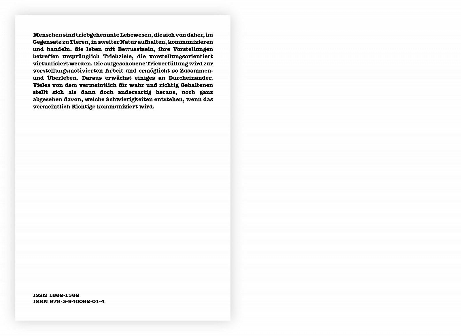Humans are instinct-inhibited beings, who therefore, unlike animals, live, communicate, and act in a second nature. They live with consciousness, their imaginations originally concern instinctual aims that are virtualized in an imaginative way. The deferred fulfilment of their instincts becomes work that is motivated by imagination and thus enables them to live and survive together. This results in a lot of confusion. Much of what is presumed to be true and right turns out to be different after all, let alone the difficulties that arise when what is presumably right is communicated.
