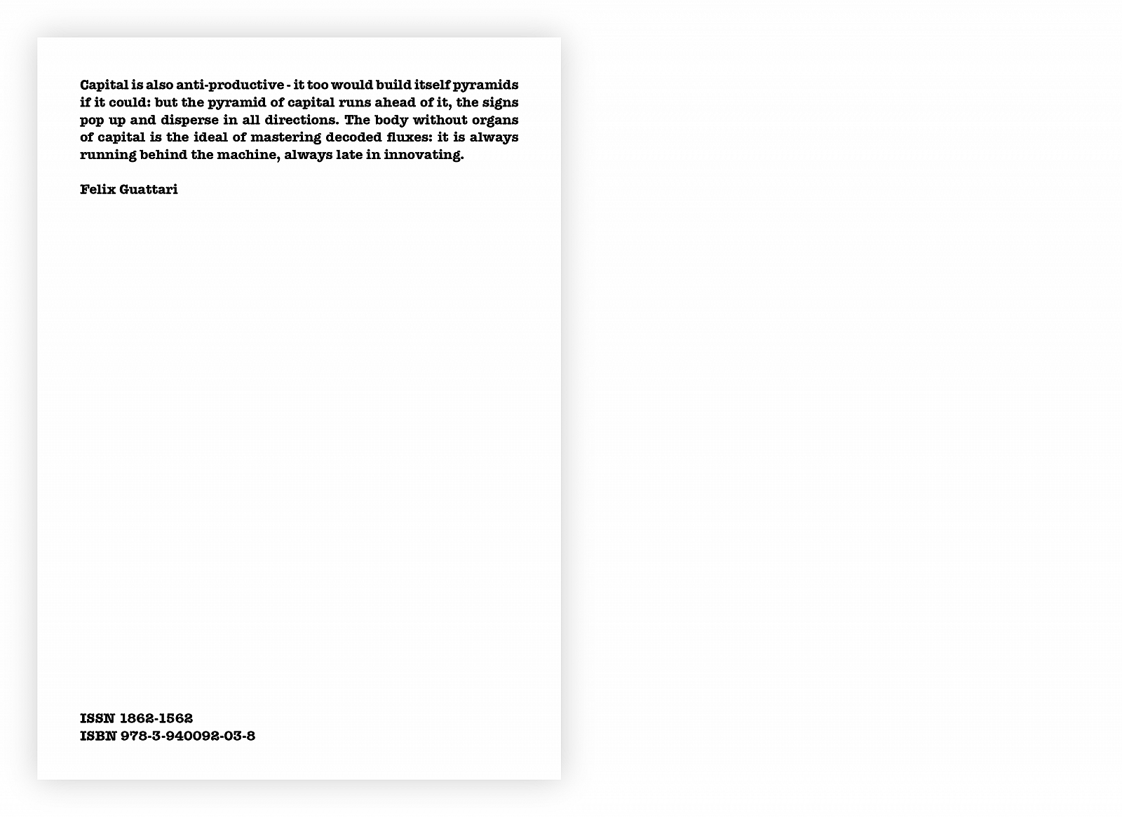 Capital is also anti-productive—it too would build itself pyramids if it could: but the pyramid of capital runs ahead of it, the signs pop up and disperse in all directions. The body without organs of capital is the ideal of mastering decoded fluxes: it is always running behind the machine, always late in innovating.