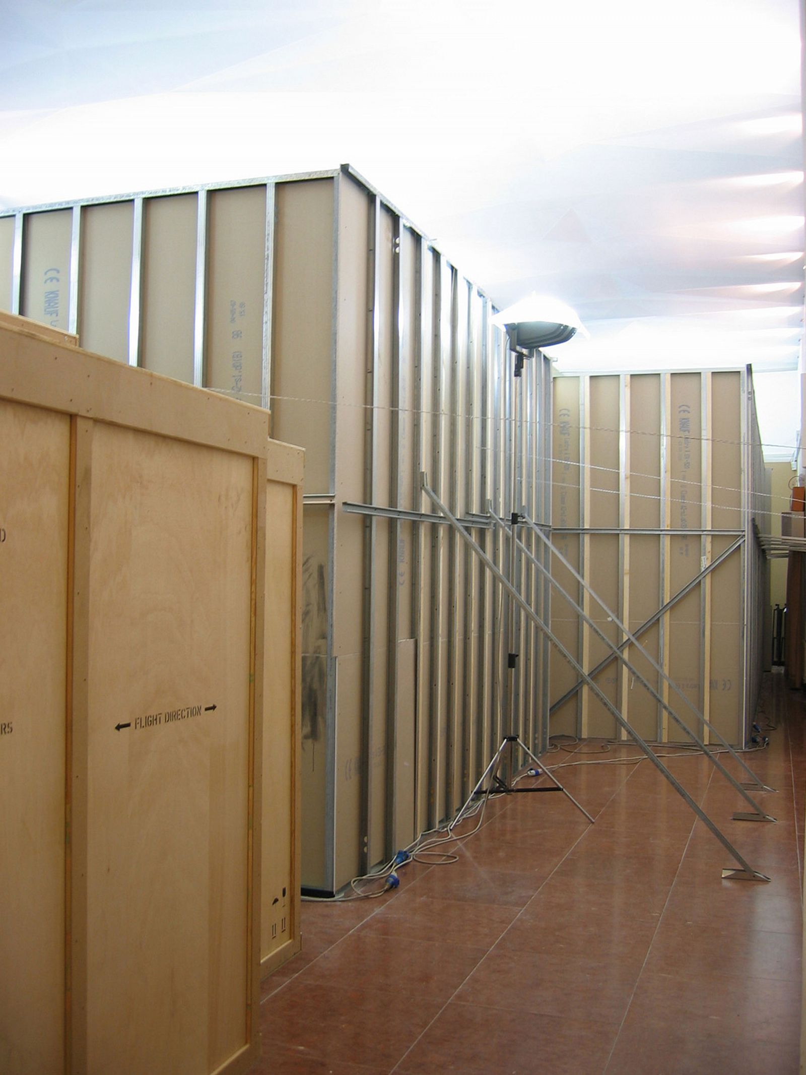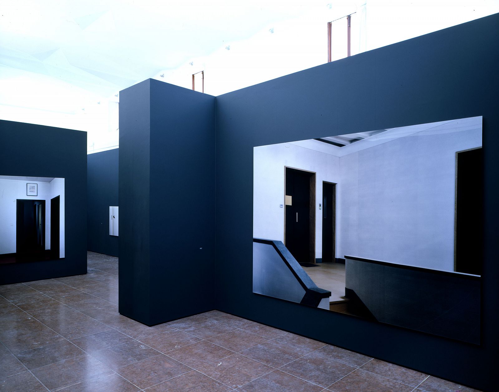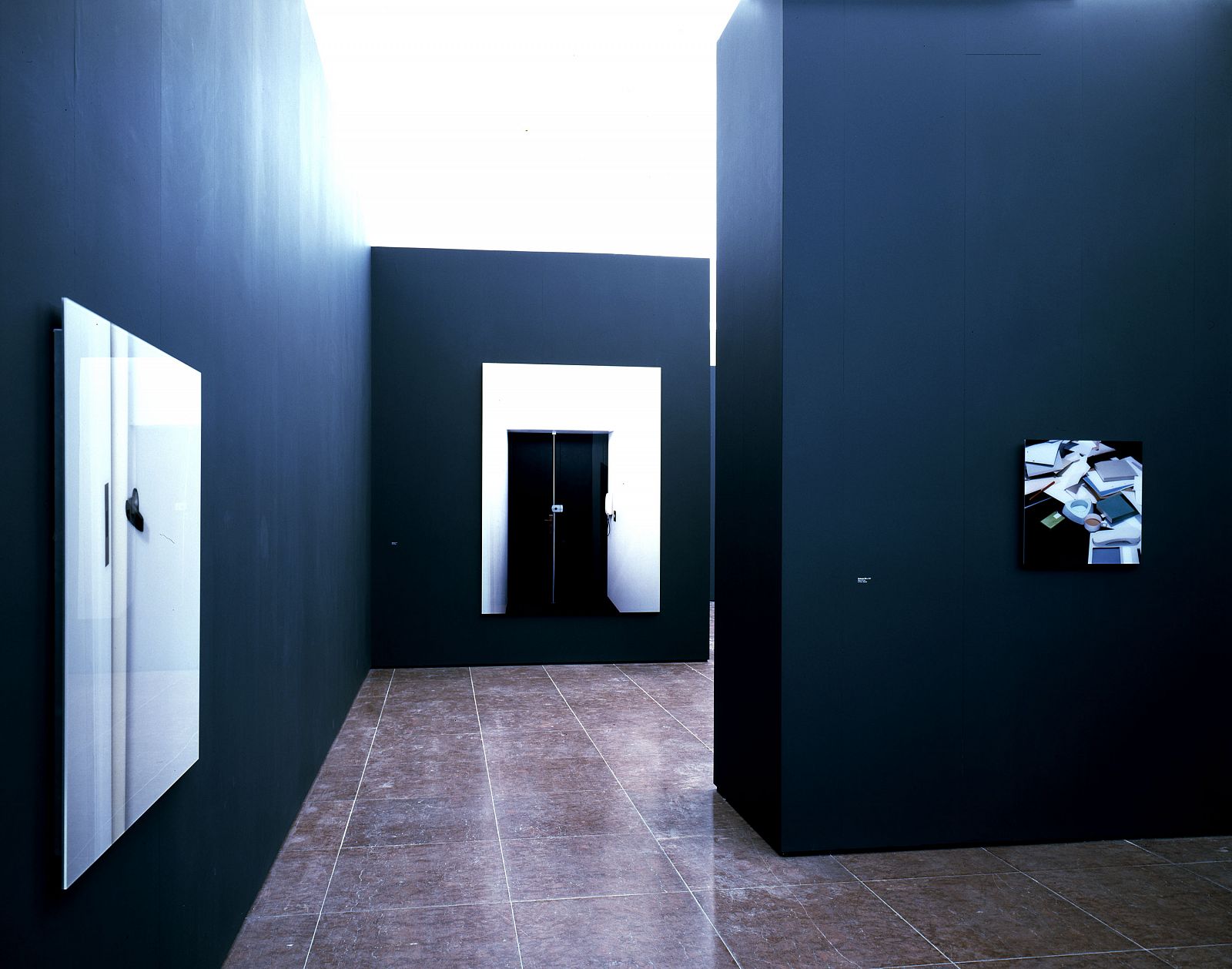 For his photo series Embassy, Thomas Demand gained access to the place where the events leading to this “smoking gun” supposedly occurred. Together with Arno Brandlhuber he later reconstructed the site as a 1:1 paper sculpture to take the photographic proof of these spaces of remembrance. In the same collaborative form, Thomas Demand and Arno Brandlhuber developed the first exhibition of Embassy as a spatial installation at the Fondazione Giorgio Cini presented by Fondazione Prada in Venice in 2007. The translation back into a physical exhibition set-up was neither a mere 1:1 reconstruction—as the paper sculpture produced before—nor a conventional white cube form of an exhibition. To indicate the spatial configuration of the actual embassy space, the walls were placed so as to align the spectator’s eye with Demand’s camera angle during his working process. The backdrop creates a cinematographic moment, in which the two-dimensionality of the images come into tension with the three-dimensionality of the rooms of the embassy in Rome. Beyond, the exhibition architecture refers to the scale of the models, which Thomas Demand usually destroys after taking the photographs. Guided by Brandlhuber’s architectural arrangement and Demand’s sequence of images, the visitor enters a construction, a manipulation of an unknown piece of recent history.