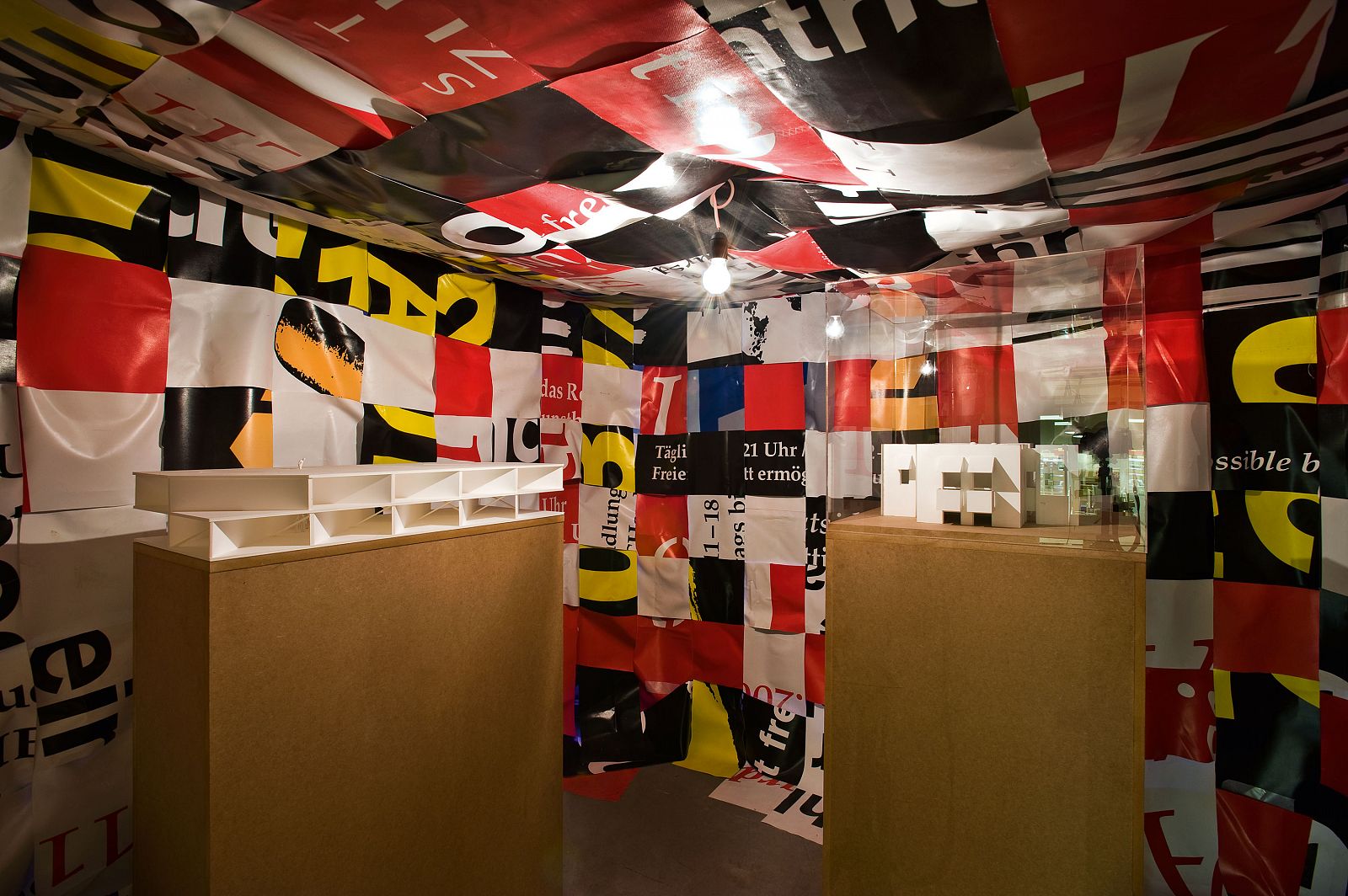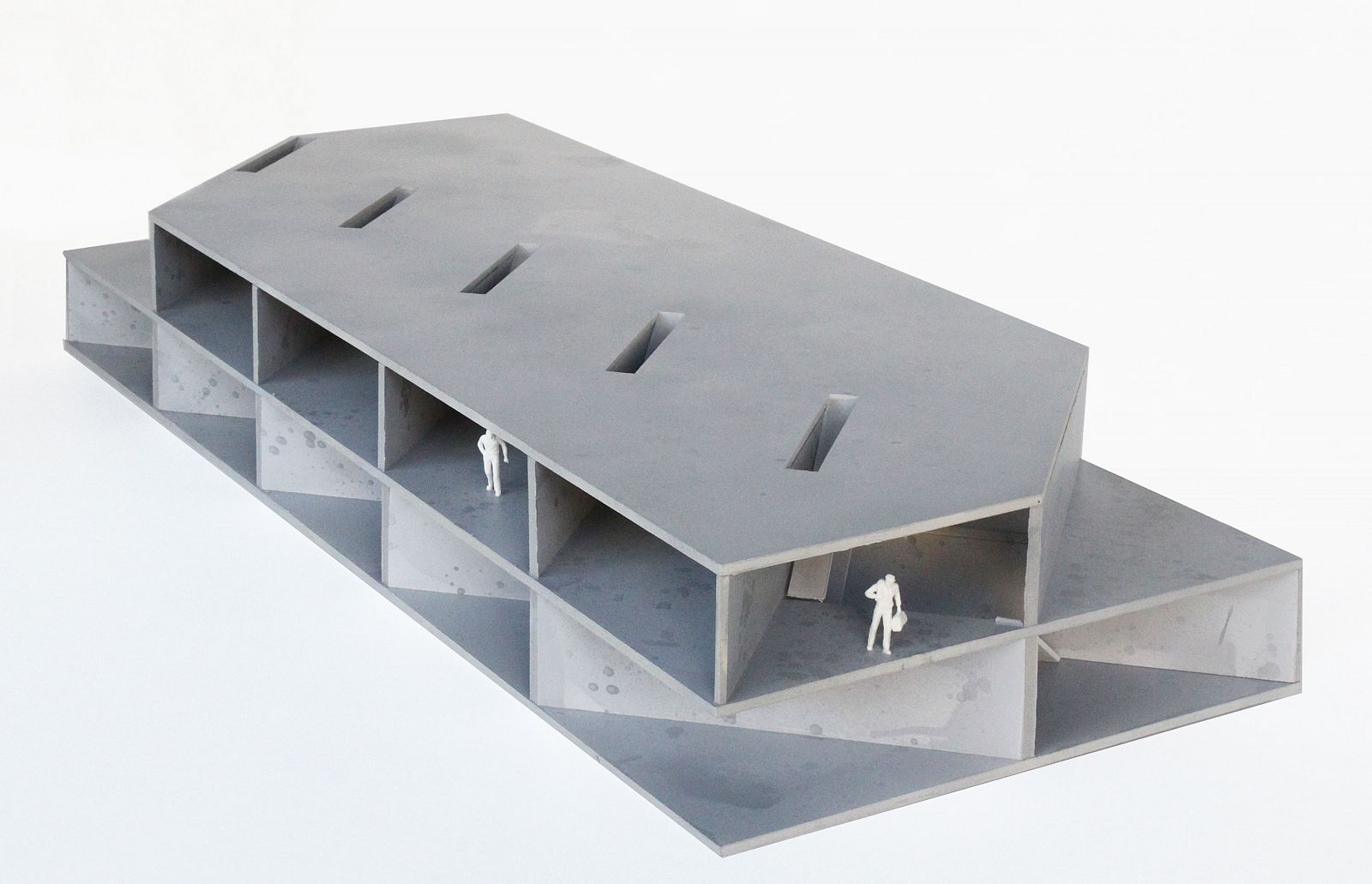 The spatial separation of working and living in functional, modernist terms is no longer in keeping. Phenomena such as digitalization, growing mobility, and the increasing flexibility of living spaces make the division between living and working obsolete. The post-industrial society requires new spaces that enable the coexistence and cooperation of different users and uses. A series of typological studies emerged from this observation that look at the agency of modular organization in the formation of live-work environments. These studies have been ongoing since the 1990s, independent of any specific commission or context. The trope of the combination of working and living areas first appeared in the 0019 Kölner Brett with its flexible, lofty units and in the 0021 Geisselstrasse project. In both cases the typological exploration began with non-determinate spaces, while the projects that followed push the typologies to further limits. Based on the same concept of interlacing working and living via two volumes with different orientations stacked on each other (0082.2 VRM Hybrid Houses), the Four-Directional Module Diagonal (VierRichtungsModulDiagonal) marks another big step in the typological experiment: the two modules are rotated so as to cross diagonally, not orthogonally, allowing the units to be arranged in an endless linear configuration. This development was first presented as a prototype at the exhibition FischGrätenMelkStand curated by John Bock in the Temporäre Kunsthalle in Berlin.