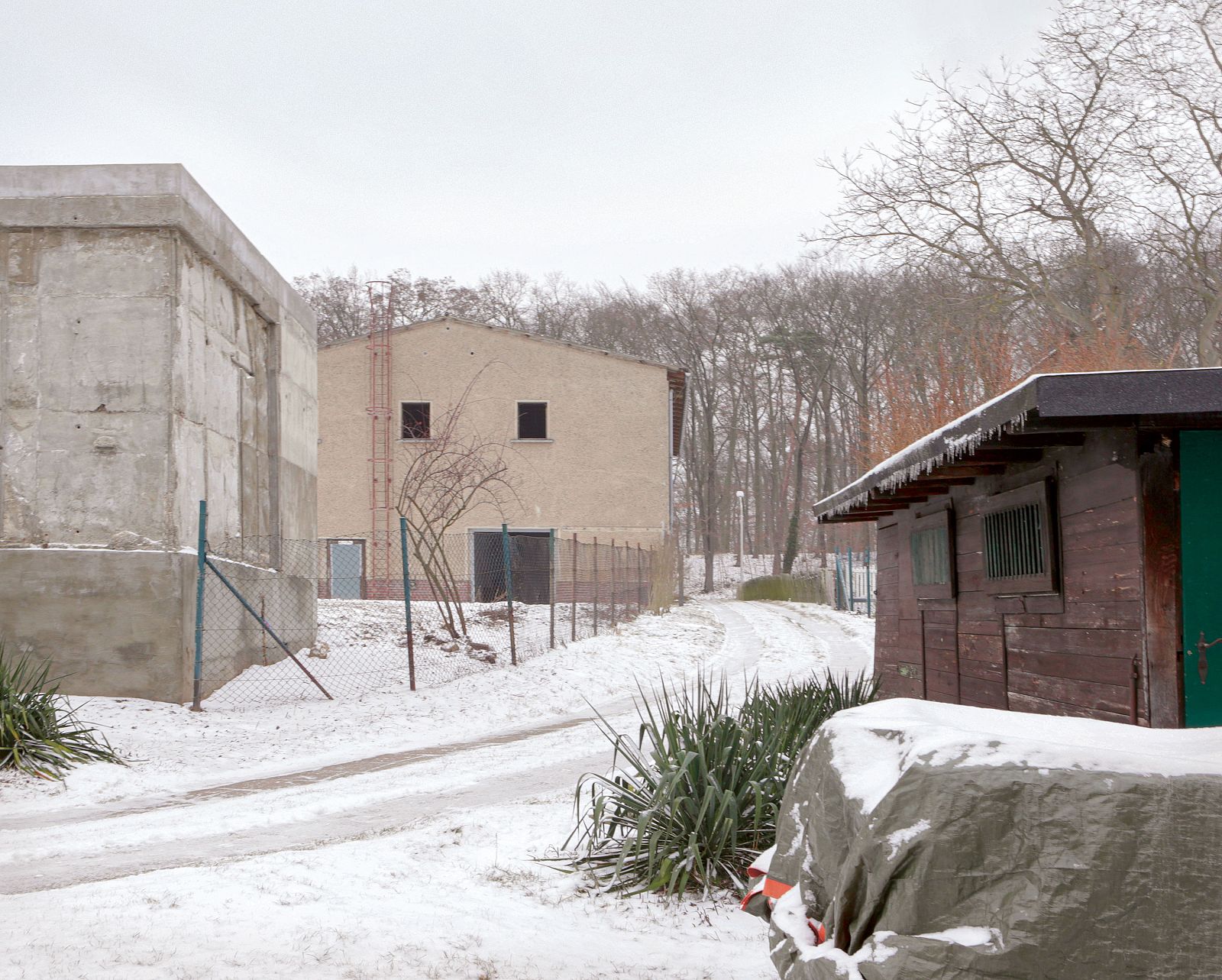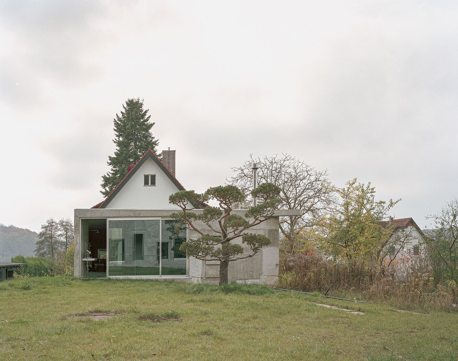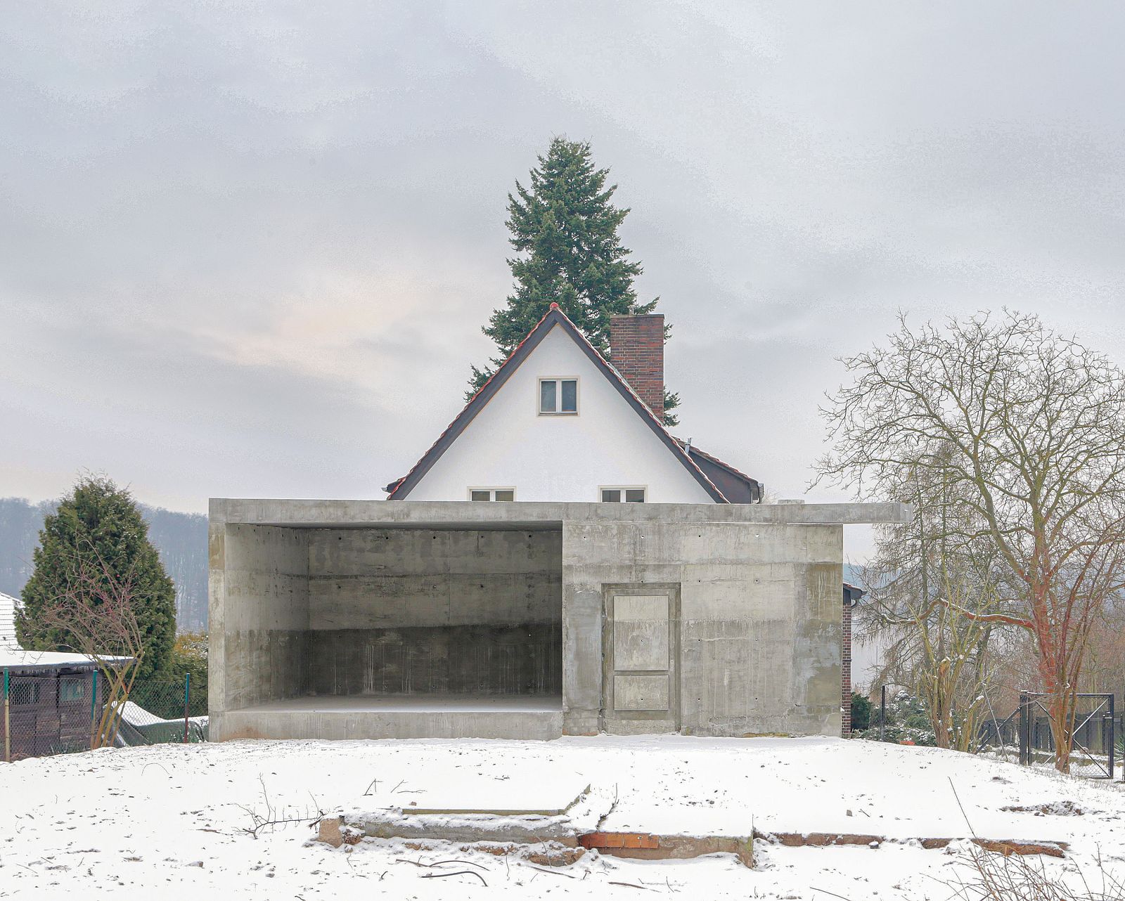 Rachel is located on the site of a former Kulturbaracke, a typical GDR typology used to bring culture to a production site. The small building was part of the industrial complex of the East German knitwear corporation Ernst Lück, located in Krampnitz, near the border between East and West Germany. Over time, the Kulturbaracke had become completely dilapidated and unusable. However, a new building was not permitted on the property. A grandfather clause (Bestandsschutzklausel) allowed modifications but only if no changes were made to the existing structure and the building would remain standing at all times. On the basis of these bureaucratic givens, the approach chosen was inspired by the eponymous English artist Rachel Whiteread, who built House (1993), a Victorian London residential building, in cast concrete.
